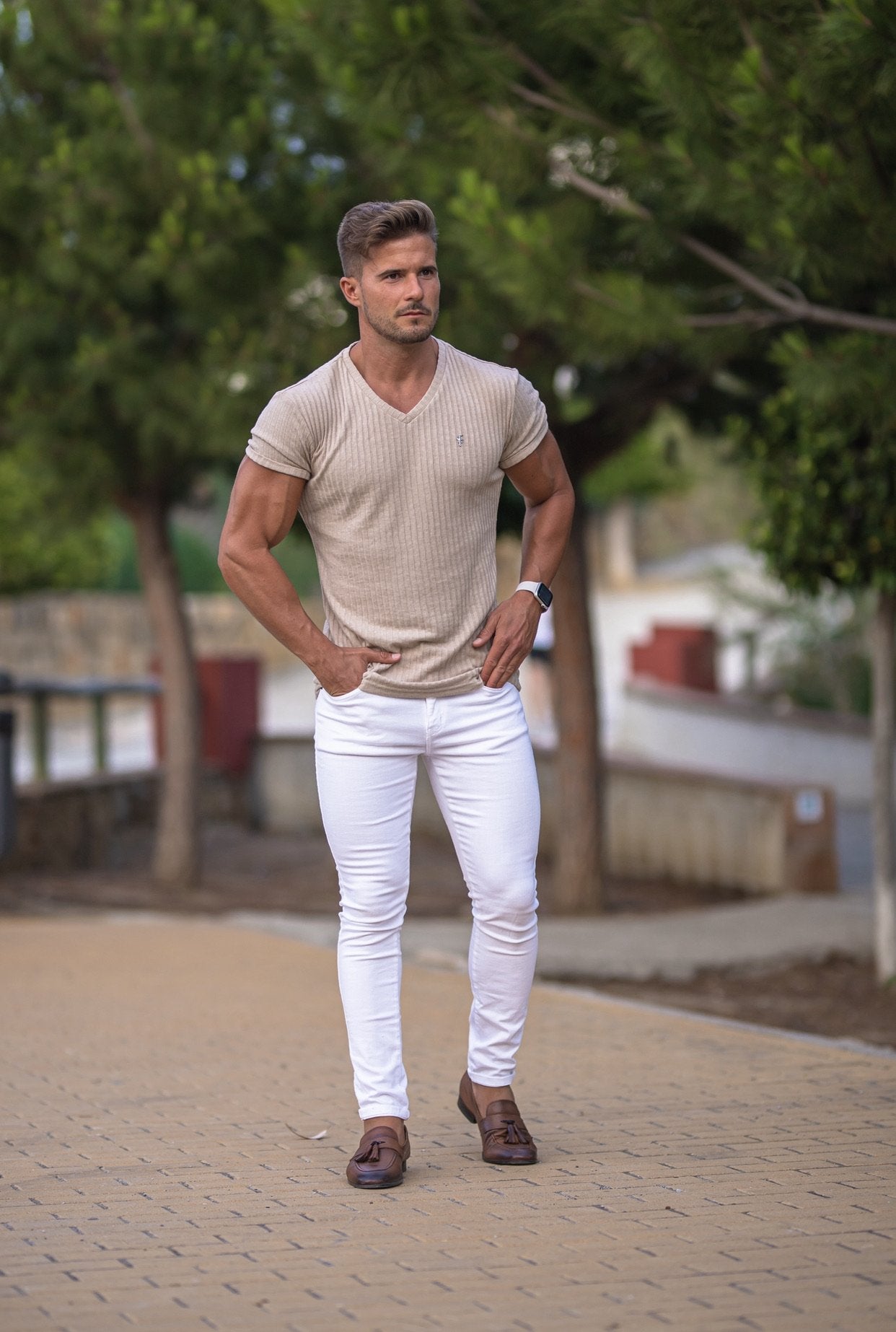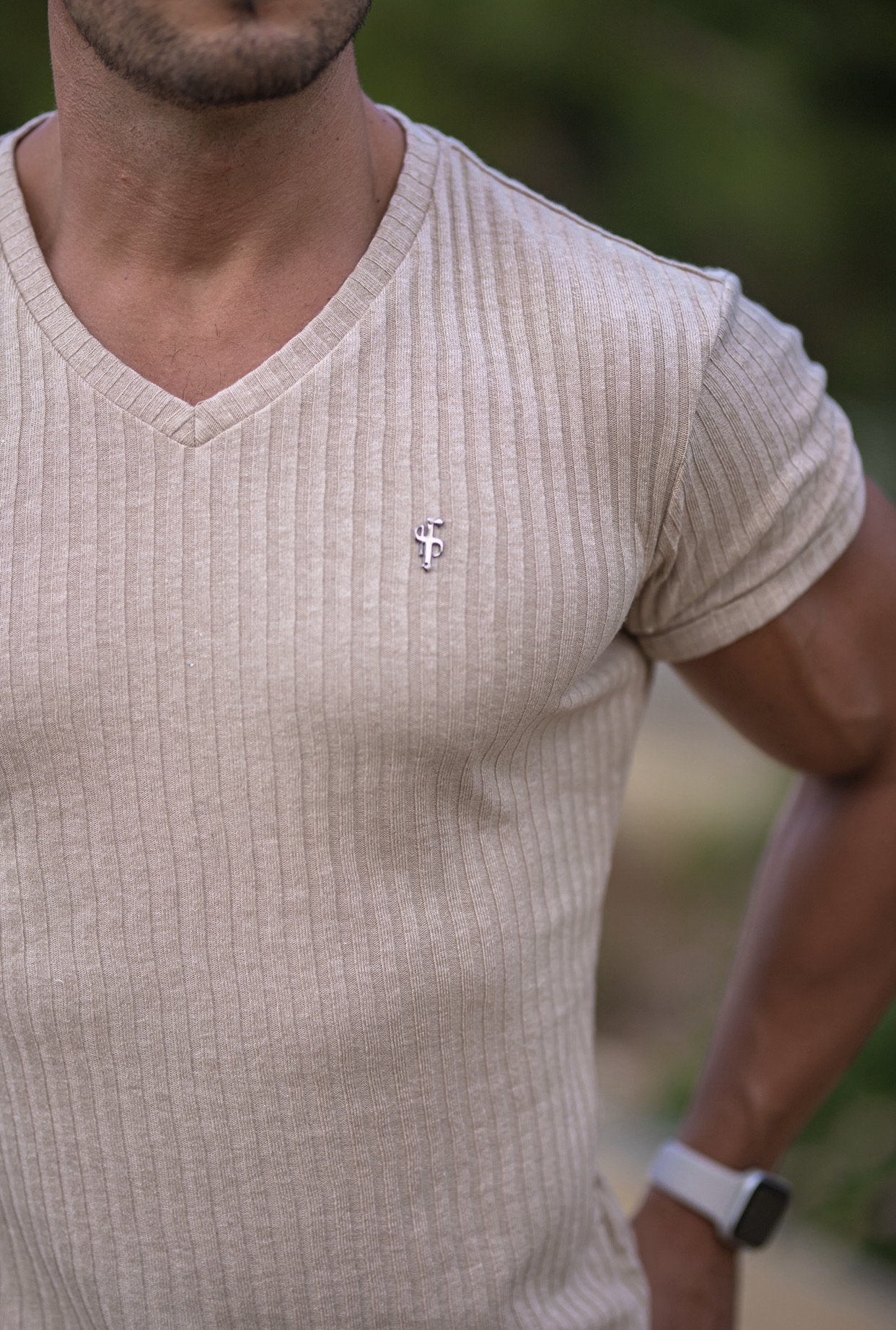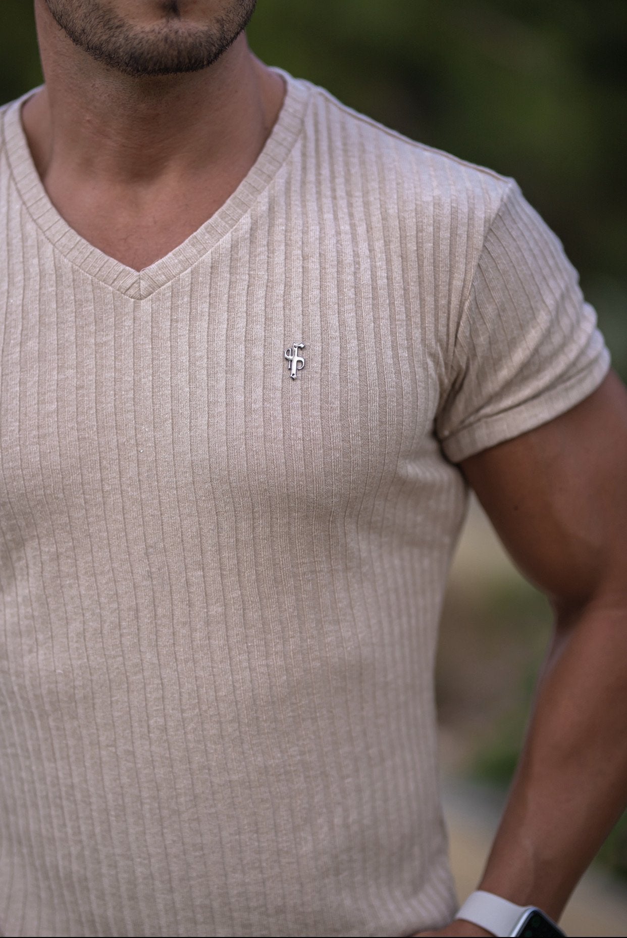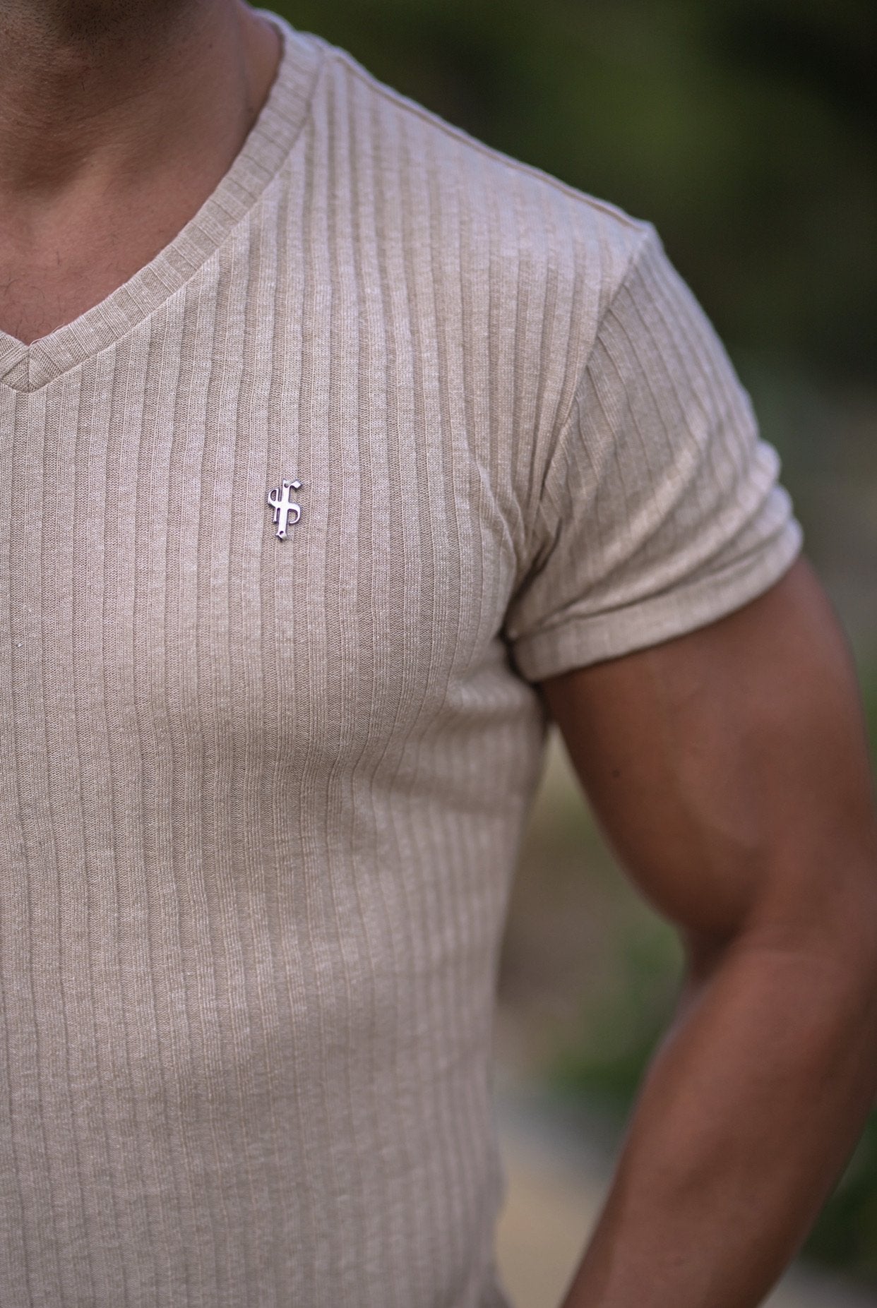 Father Sons Classic Beige / Gunmetal V Neck Ribbed Crew - FSH439